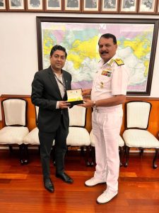 The Chief of the Naval Staff, Admiral Dinesh K Tripathi, receives a book from Manish Kumar Jha. Manish Kumar Jha briefed the CNS on his book on the military policy, which focuses on the maritime and Indian Navy's capability roadmap for leading India's quest for advanced, critical tech, next-generation warships and its design & development indigenously.
